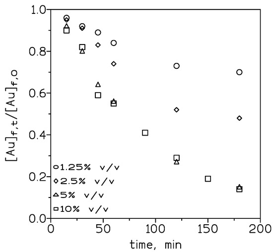 To evaluate the influence of the carrier concentration on the transport of Au(III), various concentrations of the ionic liquid in toluene were employed. Figure 3 shows that in the feed phase, the dimensionless [Au]f,t/[Au]f,0 relationship decreased when the ionic liquid concentration is increased from 1.25% to 5% v/v and then remained constant (5% to 50% v/v).