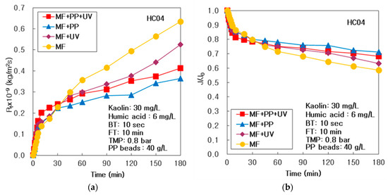 As shown in Figure 2b, to examine a comparative deterioration of treated flux, the dimensionless treated flux (J/J0), where J0 is the initial treated flux which was predicted by extrapolation using the first two J values at 1 and 2 min, could preserve the maximal in the (MF + PP) system and the minimal in the MF system. It proved that the J/J0 in (MF + PP) could be greater than those of only the MF and the (MF + UV) systems, for the reason that pure PP particles adsorption could decrease the membrane fouling more powerfully than the UV radiation photo-oxidation. As summarized in Table 2, the final value of J/J0 (J180/J0) was the maximal at 0.711 in the (MF + PP) system after 180 min operation, which was 1.22 times greater than the minimal of 0.585 in the single MF system. The highest value of 224 L/m2hr of permeate flux (J) could be attained in the (MF + PP) system, for the reason that the membrane fouling was repressed further powerfully via pure PP particles adsorption in the (MF + PP) system than in the single MF or (MF + UV) systems. Finally, the total permeate volume (VT) was the maximal at 15.3 L in the (MF + PP) system and the minimal at 13.9 L in the MF system during 180 min operation.