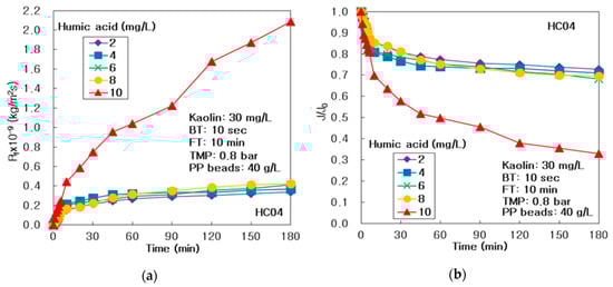 As compared in Figure 3a, the resistances of membrane fouling (Rf) improved a small amount, as HA concentration was increased from 2 to 8 mg/L; however, Rf at HA of 10 mg/L was maintained at very high values during the 180 min operation. It proved that the dissolved organic materials, like as humic acid, could generate more rigorously the membrane fouling on the surface and inside of alumina membrane, beyond the specific HA concentration, such as 8 mg/L, in the integrated system of membrane and PP particles.