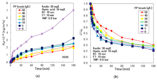 As compared in Figure 4a, the Rf presented the highest at 0 g/L of pure PP particles, and the lowest at 50 g/L during 180 min in this integrated system of multichannel ceramic membrane and PP particles using air backwashing. It means that the more amount of PP particles could inhibit more tremendously the membrane fouling in the integrated water treatment system.