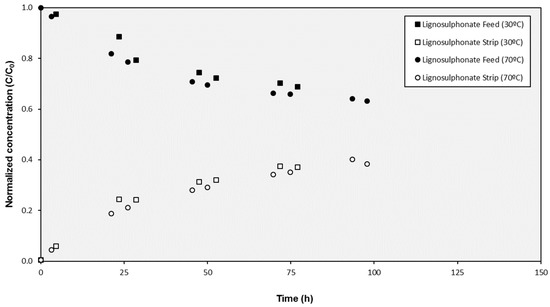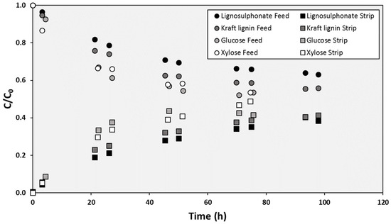 The prepared SILM, with [BMIM][DBP] supported in PTFE membrane, had demonstrated selective transport of different lignin types and monosaccharides. The evolution of the concentrations in the feed and stripping compartments when single solutions of the four selected solutes (lignosulphonate, Kraft lignin, glucose and xylose) were employed was very different. As shown in Figure 1, the transport of the monosaccharides was faster than the transport of the lignins: While 70 h was time enough to achieve monosaccharides concentrations that could be considered equilibrium values, the normalized concentrations of lignins in the stripping compartments were still below 0.4 after more than 100 h.