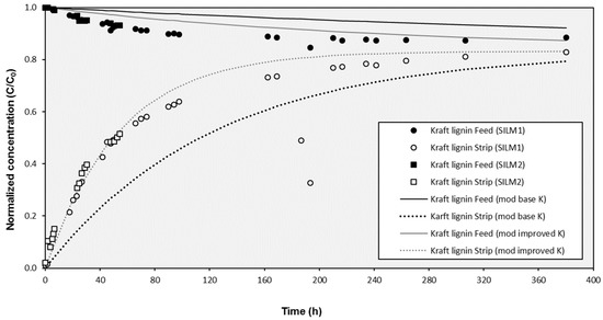 Evolution of the experimental concentration of Kraft lignin in the cell compartments during the external recirculation mode with two prepared SILMs and modeled results for the operation with recirculation (improved K) and without recirculation (base K).