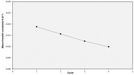 Finally, the influence of the number of consecutive cycles a SILM was employed was investigated. Some experiments were carried with different solutes to register the K values for the second cycle and compare them to the values obtained with the fresh SILMs. In most cases, the K values corresponding to the second cycle when compared to the first one were in the range of ±20% for all the solutes, with limited increases or decreases. However, a SILM tested with lignosulphonate solution in four consecutive cycles showed a linearly decreasing K value (Figure 4). Therefore, this experiment pointed to the fact that the use of these SILMs in consecutive cycles without regeneration may imply reduced performance as a consequence of fouling and/or IL loss.