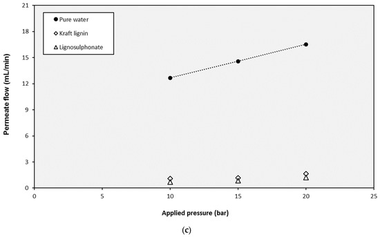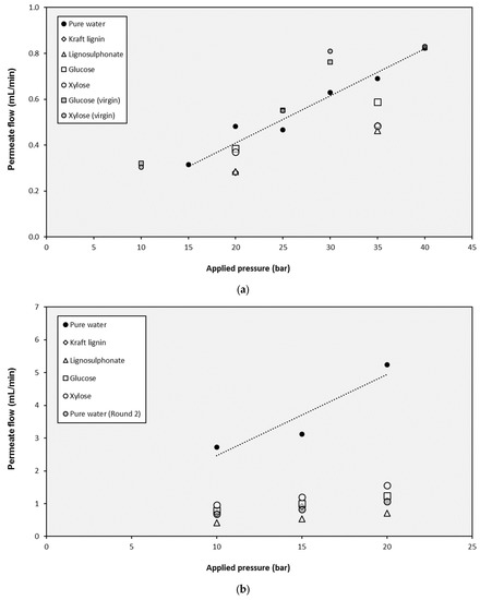 The selected NF and UF membranes were used in experiments with pure water and lignin and monosaccharides solutions. The tests with pure water were useful to assess the dependence of the permeate flux (JP) on the applied pressure (ΔP). As shown in Figure 5, the water fluxes increased with increasing pressures, obtaining linear relationships. This linear evolution of fluxes shows that Darcy’s law is verified (Equation (11) can be applied), and the slope of these straight lines are the corresponding permeability values (LP), which are compiled in Table 2.