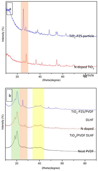 XRD pattern of (a) N-doped TiO2 particle and TiO2-P25 particle (b) N-doped TiO2/PVDF, TiO2-P25/PVDF DLHF and neat polyvinylidene fluoride (PVDF) membranes carried out at 40 kV and 40 mA, which employed a CuKα radiation at a wavelength of 0.15418 nm at an angular incidence of 2θ = 20–80°.