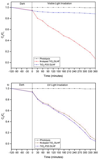 Photocatalytic degradation of BPA by N-doped TiO2 and TiO2-P25 DLHF membrane under (a) visible light and (b) UV light irradiation for 360 min of activity.