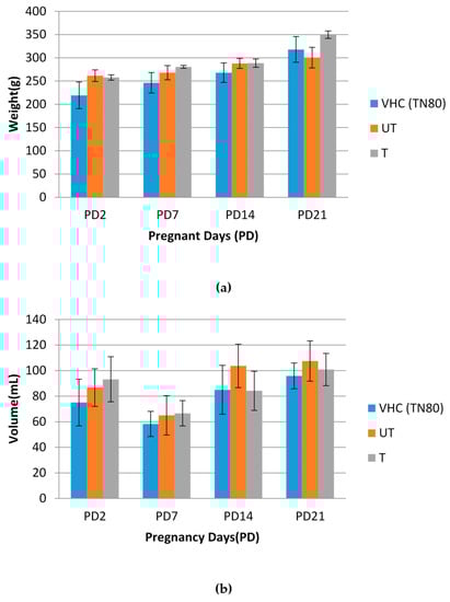 Effects of BPA on general health status of rats: (a) body weight of rats (wt); (b) drinking pattern of rats. Data are expressed as means. (n = 4–6 rats per group). VHC (TN80): Vehicle Control Group Tween 80; UT: Untreated BPA water; T: Treated BPA water.