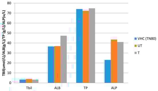 The liver function test results of treated rats. TBil: Total Bilirubin; ALB: Albumin; TP: Total Protein; ALP: Alkaline Phosphatase. VHC (TN80): Vehicle Control Group Tween 80; UT: Untreated BPA water; T: Treated BPA water.