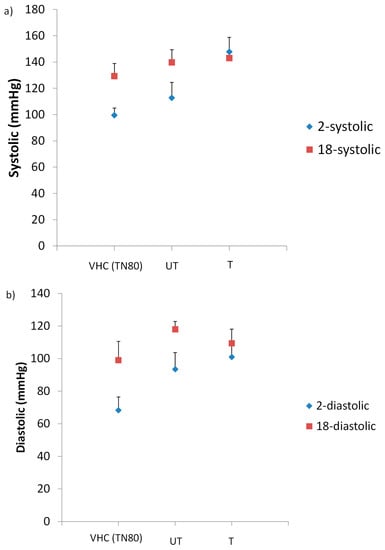 (a) Systolic and (b) diastolic blood pressure readings among treated rats. Data are expressed as means. (n ≥ 3 rats per group). 2-systolic/diastolic: diastolic BP reading on first week of treatment; 18-systolic/diastolic: diastolic BP reading on third week of treatment.
