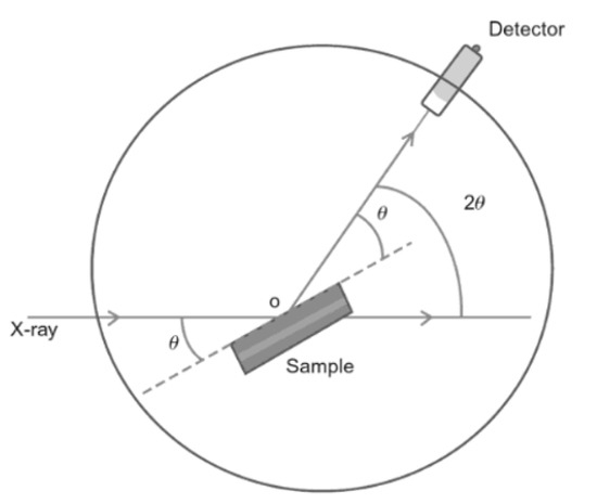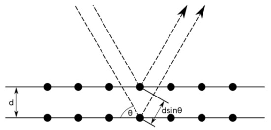 In XRD, a filament such as tungsten is used to generate an X-ray beam [60]. This beam is directed to the sample and the scattered X-ray is detected and analyzed. Figure 13 shows how XRD analysis is performed. Some X-rays will be reflected upon hitting the surface while some will enter the surface and then reflect as shown in Figure 14. This variation is called diffraction and Bragg’s law can be applied to calculate the diffraction angle (2θ) [61]: