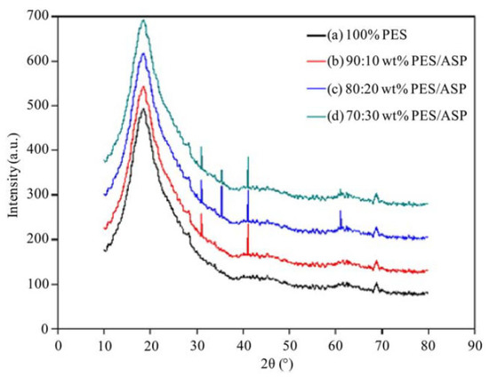 In polymeric membranes, there is a tradeoff between permeability and selectivity due to the nature of the polymer [1]. Mixed-matrix membranes can overcome this limitation by adding fillers of another material to the polymer during the membrane preparation [65]. XRD can be beneficial for studying the effect of adding the fillers to the polymer matrix. The fillers are supposed to be detected in the XRD peak profile along with the polymer. For example, a mixed-matrix membrane was made by adding aluminosilicate particles to polyethersulfone with different concentrations [66]. XRD data revealed that the intensity of polyethersulfone peaks increased making the structure more crystallized, which enhanced the mechanical properties (Figure 15). Some researchers also observed the relationship between the intensity and gas permeation and they concluded that the higher the intensity, the lower the permeation [67]. This was interpreted by the limitation in gas diffusion through the membrane as the structure becomes more crystallized [68].