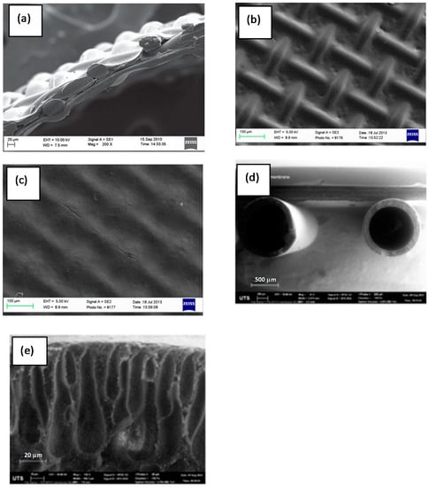 Images of hydrophilic Cellulose Triacetate (CTA) membrane on embedded polyester screen support: (a) cross section (reprinted from [] with permission from Elsevier); (b) Support side; (c) active side. SEM images of hydrophobic Polyamide (PA) hollow fibre membrane (reprinted from [] with permission from Elsevier) with inner surface of the hollow fibre as active layer, and the outer surface as support layer; (d) cross section showing the thickness of the lumens along with pores (e) enlarged cross section showing the lumen.