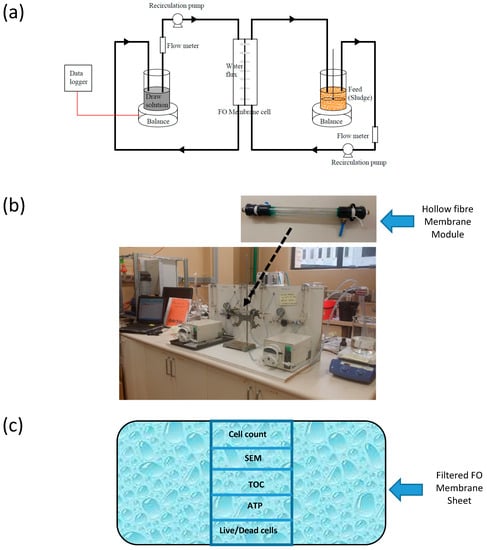 Hollow fibre membrane (a) schematic of the experimental set up with a general forward osmosis (FO) membrane cell that can accommodate either a flat sheet or a hollow fibre membrane module, (b) photo of the hollow fibre FO membrane system used in this study (Effective membrane area is 25.45 cm2), and (c) protocol for the analyses of fouled membrane.