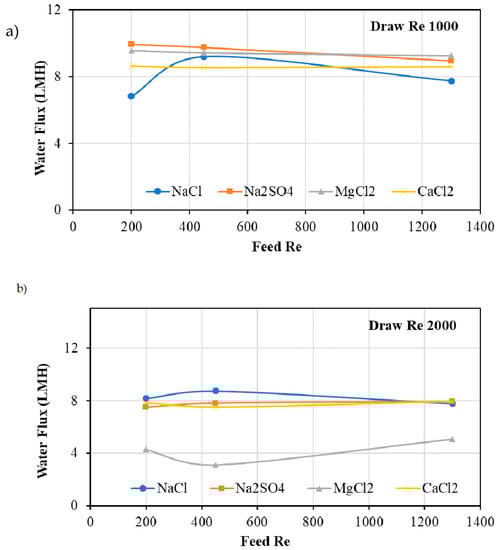 Figure 3 shows the water flux through hollow fibre FO membranes when DI water and salt solutions were used as feed and draw solutions, respectively. Draw Re was kept at 1000 and 2000 while feed Re was kept at 200, 450, and 1200. Thus, six experiments with different feed and draw Re were conducted. Water flux of up to 10 LMH was observed when a laminar condition (Re = 1000) prevailed in the flow of draw solution. The Na2SO4 draw solution gave the highest flux similar to that of MgCl2. This is interesting as 1.0 M MgCl2 has the highest osmotic pressure; however, when the Re is similar, 1.0 M Na2SO4 shows similar performance even though its osmotic pressure is lower. Furthermore, when the Re of draw solution flow was increased to become near turbulent (at Re = 2000), all three draw solutions showed better performance compared to MgCl2. The MgCl2 solution drew a maximum of 5.1 LMH when the feed Re was the highest (1200). Therefore, it is evident that, when selecting a draw solution, not only its osmotic pressure, but also its viscosity, density, and the crossflow velocity are affecting the performance in terms of water flux.