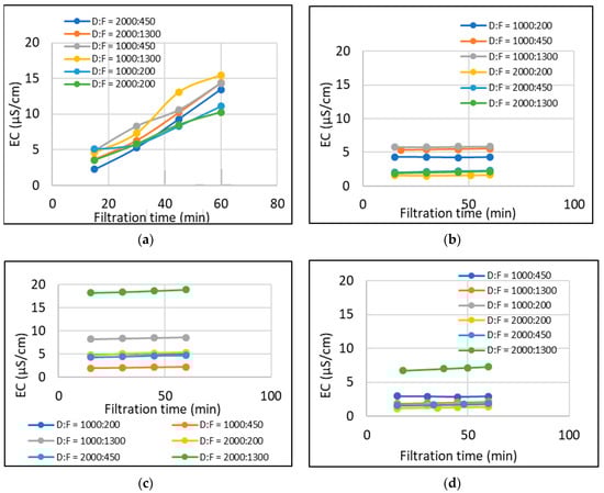 Reverse salt flux of the membrane was determined by measuring the EC values of the feed solution. Since the feed solution was DI water, the change in EC was obviously due to the ions transported through the membrane from the draw solution. Figure 4 shows the RSF (or EC values of the feed solution) for each draw solution. NaCl shows the highest increase in RSF with time. Despite the Re, RSF is increasing with the filtration time. CaCl2 shows the lowest RSF (below 5 µS/cm). MgCl2 which showed lower water fluxes compared to the other salt solutions shows lower RSF—however, higher than that of CaCl2. In general, the RSF in hollow fibre membrane was found to be small which was also the case in the literature [,]. Addition of divalent ions into the NaCl draw solution reduced the RSF but did not affect the flux, and MgCl2 was found to be a better additive []. However, multi-valent cations can form complexes with organic and colloidal foulants and expedite fouling and cake-enhanced osmotic pressure [,,,].