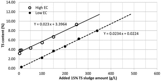 TS content of sludge with high and low EC (prepared in the laboratory starting with dewatered sludge having 15% TS obtained from PSDP).