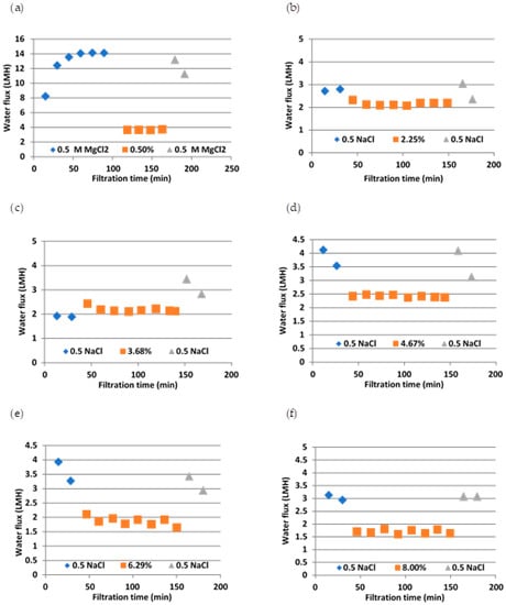 Flux at different sludge contents. Experiments were conducted at first with either MgCl2 (a) or NaCl (b–f) as draw solutions and DI as feed solution (shown in ♦) and then different concentrations of sludge were used as feed solution and reverse osmosis concentrate (ROC) as draw solution (shown in ■), and, finally, the membrane was cleaned and experiments were reverted back to original MgCl2 or NaCl as draw solutions and DI as feed solution (shown in ▲).