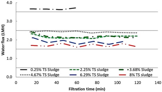 Since the same membrane was used for each experiment (after cleaning), before and after the two-hour sludge dewatering, baseline experiments were run with 0.5 M NaCl and DI water as draw and feed solutions, respectively. This was to check whether the membrane coupon had returned to the initial condition after cleaning. The results are shown in Figure 6. As Figure 6 illustrates, cleaning has taken the membrane back to the original condition. This means, since the sludge dewatering time was only two hours, the membrane was either not fouled or the fouling is nearly 100% reversible. However, to compare the water flux at each sludge solids content, averaged water fluxes were plotted in one graph as shown in Figure 7. As Figure 7 shows, the lowest sludge solids content led to the highest water flux, i.e., 3.6 LMH, whereas all the other sludge types showed a flux of 1.5–2.5 LMH. When sludge solids content increased, there was a slight drop in the water flux. With increase in solids content, the viscosity and the density of the sludge increase. Higher viscosity means lower Re, and higher density means higher Re; however, the combination of higher viscosity and higher density led to lower water permeation through the hollow fibre membranes. The effect of higher amount of solids content was dominant, and this would have increased the concentration polarisation (CP) effect as sludge passed through the porous side of the membrane leading to lower water flux.