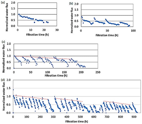 Flux through FO membrane during long-term filtration (a) 1 day; (b) 4 days; (c) 1 week; and (d) 5 weeks.