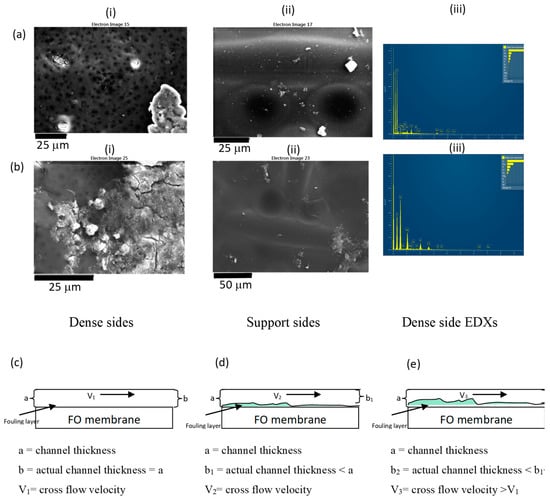 SEM images and EDX spectra of the membrane surface after (a) one week, (b) five weeks of filtration; schematic diagram of the FO membrane surface with filtration time: (c) initially, (d) during the first two weeks of operation, and (e) after about two weeks of operation. Fouling layer thickness increased over time so does the cross-flow velocity.