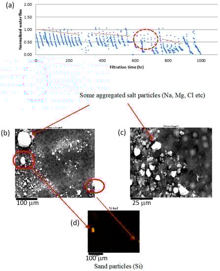 The water flux pattern with time is shown in Figure 8. Flux declined with filtration time due to two reasons (1) fouling and (2) dilution of the draw solution as draw solution was recirculated. However, flux increased when the draw and feed solutions were replaced with fresh solution. This increased flux was lower than the initial flux of the previous batch due to fouling of the membrane. Flux decline due to fouling is shown in red dashed lines in Figure 8c,d. After one week of filtration, the flux declined further in Figure 8c due to the thickened fouling layer deposited on the membrane. The layer may have contained microorganisms and salt deposits as both draw and feed solutions contain salt ions. However, as the EDX spectrums shown in Figure 9a(iii),b(iii), after one week of continuous filtration, the FO system showed only salt deposits. This fouling could easily be removed by providing regular flushes at high cross flow velocities as deposited layers were thin and loose.