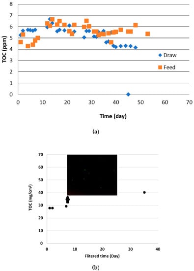 Draw and feed solutions were replaced with fresh draw and feed samples every 24 h. The used feed and draw solution TOC values were measured daily. Eight weeks of TOC results are reported in Figure 11a. During eight weeks of filtration, TOC of the feed and draw solutions fluctuated. Once the 1-day, 4-day, 1-week, 5-week and 8-week filtration runs were completed, a known area of membrane was selected (as shown in Figure 2c) and vortexed with DI water to extract the deposited fouling layer. The extracted liquid was used to analyse the TOC content per unit of membrane area (Figure 11b). TOC on the membrane surface has increased 10 mg/cm2 when the filtration time increased from one day to five weeks. In addition, microorganisms started to grow on the membrane surface after one week of continuous filtration. As shown in Figure 11b, live and dead cells were propagated over the membrane surface which then led to reduction of water flux. Therefore, membrane may be needing at least a weekly cleaning cycle to avoid this. In the eight weeks of the filtration trial, the TOC value was significantly low (only 10 mg/cm2), which is hard to explain why. All the experiments other than an eight-week filtration trail were triplicated. Therefore, another duplicate experiment for an 8-week trial would be required to confirm the TOC results.