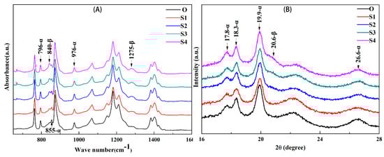 Figure 1 shows the ATR-FTIR spectra (A) and the WAXD diffractograms (B) of the membrane samples stretched with different stretching ratios. As shown in Figure 1A, generally all the membrane samples show the characteristic α phase bands (796, 855, and 976 cm−1), which means the crystalline phase of all the membrane samples is still dominated by α, which agrees with the results of the previous literature []. As the stretch ratio increased from 0% to 100%, the intensity of the characteristic α phase bands does not change significantly, while that of characteristic β phase bands at 840 and 1275 cm−1 increases gradually, which suggests that the stretching and annealing treatment can result in an enhancement in β crystalline phase formation, and the β crystalline phase intensity increases with a rise in the stretching ratio. This trend can also be obtained from Figure 1B. The X-ray diffractograms of all the membrane surfaces are seen to have well-defined peaks at 2θ = 17.8°, 18.3°, 19.9°, and 26.6°, which correspond to (100), (020), (110), and (021) crystal plane of α-phase []. This phenomenon also demonstrates that α-phase holds a dominant position in the membranes before or after the stretching, although after the stretching and annealing, a shoulder peak at 2θ = 20.6° that corresponds to (110/200) plane appears and gradually becomes obvious as the stretch ratio is increased from 50% to 100%. Whereas the peak at 2θ = 20.6° is hardly observed in the Sample O and S1, which further confirms the influence of the external treatment on the crystal transformation. It should be noted that the intensity of the characteristic β phase is not obvious as the stretching ratio is lower than 50%, and becomes evident as the stretching ratio is getting higher, which agrees with the results of the literature [] that “stretching the fibers up to 40% was not enough to induce any detectable β phase crystals”.
