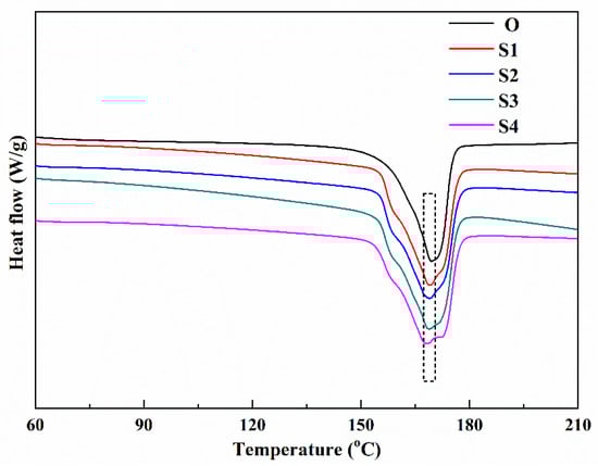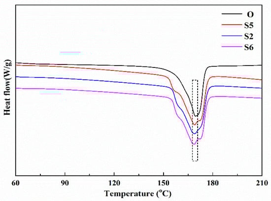 Figure 7 shows the DSC curves of Samples S5, S2, and S6 and Table 1 lists the melting peak points and total crystallinities of the four samples. As shown in Figure 7, the DSC curves of Samples S5, S2 and S6 look similar and they all have a small melting peak near 157 °C, as well as double melting peaks marked by the dashed box as compared with that of Sample O. Combining Figure 7 with Table 1, it is observed that with a rise in the stretching rate from 20 mm/min to 80 mm/min, there is not much difference in the total crystallinities, the melting points, and the DSC curves, indicating that changing the stretching rate from 20 mm/min to 80 mm/min does not obviously change the recrystallization and the total crystallinities, which agrees with Figure 6.