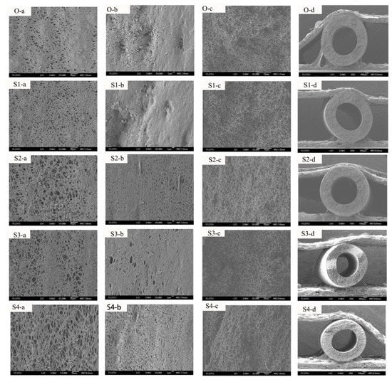The scanning electron microscope (SEM) photos of the inner surface, the outer surface, cross-section (along the stretching direction), and the whole cross-section of the membrane samples stretched with different stretching ratios. In the figure, a, b, c, and d represent the inner surface, the outer surface, the cross-section (along the stretching direction), and the whole cross-section of the hollow fiber membrane samples, respectively.