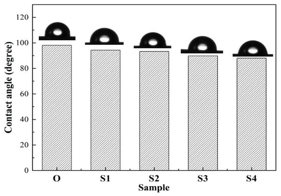 Figure 4 shows the contact angles of the membrane samples with different stretching ratios. As shown in the figure, the contact angles of the membrane samples are gradually decreased by increasing the stretching ratio, indicating hydrophilicity of the membrane samples is enhanced correspondingly, which supports the PWF results of Table 2. According to the literature [], the surface roughness and porosity also influence the contact angle values. Nevertheless, as shown in Figure 3, the outer surface structure of Sample S1 is similar to that of Sample O due to the fact that the stretching ratio is only 20%, whereas the contact angle of Sample S1 is still smaller than that of Sample O. Thus, the decrease in the contact angles should be attributed to the formation of the β crystalline phase of PVDF because normally the β crystalline phase has higher polarity [,]. The phenomenon suggests that increasing the stretching ratio results in an enhancement in the content of the β crystalline phase, which is in accordance with the results of Figure 1.