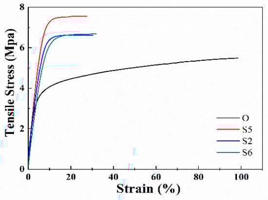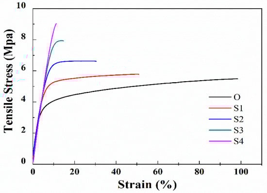 Figure 5 and Table 2 show the influence of stretching ratio on mechanical properties, including the stretching curve and the tensile strength of the membrane samples stretched with different stretching ratios. As the stretching ratio is increased, the tensile strength of the membrane samples is increased from 5.48 MPa of Sample O to 9.01 MPa of Sample S4. Figure 5 demonstrates that due to the stretching and annealing treatment, elastic modulus (slope of the stress-strain curves) of the membrane sample is almost unchanged while the elongation at break is depressed as the stretching ratio increased from 0% to 50%, indicating that the membrane samples gradually become stiff. This can be explained by the promotion in the crystallinity and these results are in accordance with the literatures [,,], which indicates that increasing the membrane crystallinity and the β crystalline phase content can prompt the tensile strength of the PVDF membranes but decrease the membrane strain (the elongation at break). As the stretching ratio is increased to 80% and even 100%, the tensile strength of the membrane samples has risen to 7.83 and 9.01 MPa, while the elongation at break drops sharply, indicating that the membrane samples have become stiff and brittle. This is due to fact that at the large stretching ratio, the intense tensile force results in separation of the lamellas and the extension of the molecular chain, and thus defects such as macropores are formed in the membrane structure. As a result, the big change in the tensile strength and elongation at break is mainly related to the membrane structure damage when the stretching ratio is 80% and 100%.
