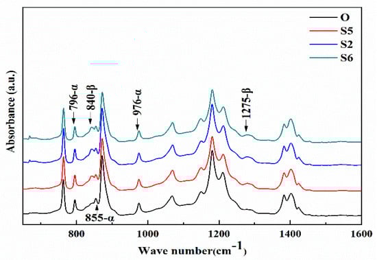 Compared to the stretching ratio, the tensile force is also related to the stretching rate. This section further investigates the effect of the stretching rate on the crystallization behavior and performance of the membrane samples. Figure 6 shows the ATR-FTIR spectra of the membrane samples stretched with different stretching rates. Compared to Sample O, the ATR-FTIR spectrum of the membrane samples obtained by the stretching and annealing treatment all present characteristic β-phase bands at 840 and 1275 cm−1, indicating that the external treatment contributes to the crystal transformation of PVDF partially from α phase to β phase. This is consistent with the results of Figure 1. Theoretically, increasing the stretching rate always suppresses relaxation of the tensile force in the molecular chains during the stretching, thereby reducing the degree of crystal transformation. However, as shown in Figure 6, the intensity of the characteristic β phase bands at 840 and 1275 cm−1 does not vary visibly with the change in the stretching rate, which implies that the stretching rate has little effect on the formation of β crystal phase.