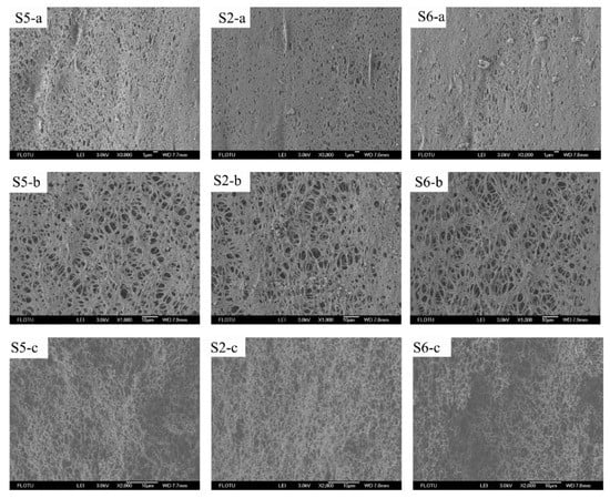 The SEM photos of the outer, inner surface, and the cross-section (along the stretching direction) of the membrane samples stretched with different stretching rates. In the figure, a, b and c represent the outer surface, the inner surface, and the cross-section (along the stretching direction) of the hollow fiber membrane samples, respectively.