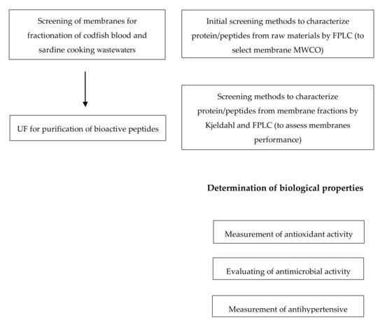 The scheme of the different experimental studies performed in this work is presented in Figure 1. In order to select the fractions enriched in biopeptides from the raw materials under study with maximized biological properties, the quality of the different permeates produced by ultrafiltration will be assessed by the quantification of the peptides/proteins present, also discriminated in their sizes (by FPLC), as well as by the determination of different types of biological activities (specifically antioxidant, antimicrobial and antihypertensive activities).