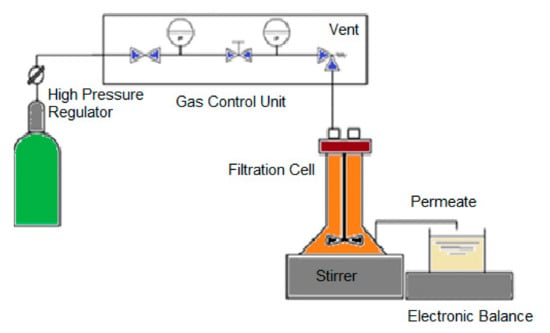 In this work, the membrane was used to permeate the target peptides. For the purification of bioactive peptides with certain MW, the selection of the MWCO of the membranes was made according to the characterization of the raw materials by FPLC, as shown in Figure 1. After the selection of the membranes, the membrane experiments were performed in the dead-end mode under controlled transmembrane pressure using flat sheet membranes at 0.1 and 1.0 bar with one module (Amicom, Merck, Darmstadt, Germany, 45.4 × 10−4 m2 membrane area) and at 5.0 bar with another module (METCell, Membrane Extraction Technology, London, UK, 51.4 × 10−4 m2 membrane area). The permeate mass was measured with the an electronic balance (Kern 572, Kern, Frankfurt, Germany). The feed vessel was stirred at 500 rpm, processing 200 g of codfish blood and sardine cooking wastewaters. The scheme of the ultrafiltration experiment is shown in Figure 2.