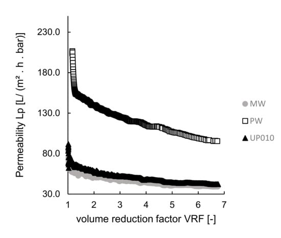 The performance of the membranes was assessed by measuring permeabilities. The permeabilities of the different membranes were plotted against the volume reduction factor, VRF [–] (the ratio between the initial feed volume and the retentate volume), as presented in Figure 3. When comparing PW and UP010 membranes with the same MWCO (10 kDa), the different values of permeability obtained could be explained by the hydrophilic behavior of the membranes, measured by the contact angles, which were much different (see Table 2). In fact, membrane PW had a lower contact angle (22.86° ± 1.36°), and thus, a higher hydrophilic behavior, than membrane UP010 (with a contact angle of 56.30° ± 2.46°), which could explain the higher permeability values when PW membrane is used. As both PW and UP010 commercial membranes are comprised of the same polymer material (polyethersulfone), the higher hydrophilicity behavior of PW might be explained by a treatment performed by the producer to turn the membrane more hydrophilic.
