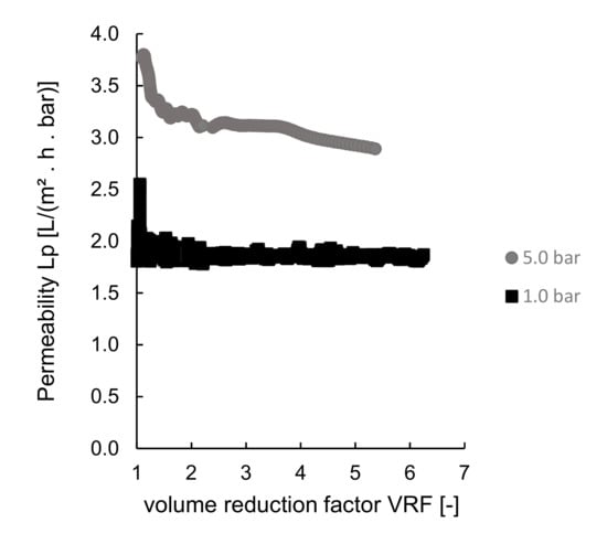 Pre-treated sardine cooking wastewaters were processed with the GH membrane from GE Suez at 1.0 bar and 5.0 bar transmembrane pressures. The permeabilities at different transmembrane pressure are plotted against the adimensional volume reduction factor, VRF [–], as presented in Figure 4.