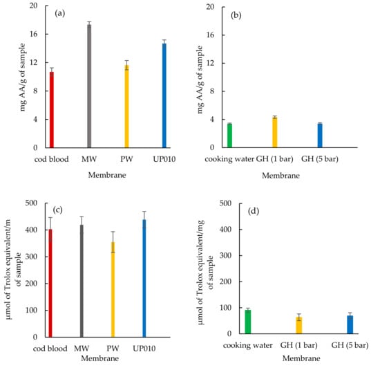 Antioxidant activities of fish by-products (codfish blood and sardine cooking wastewaters) and corresponding peptide fractions. (a) ABTS+ radical scavenging activity for codfish blood and the corresponding peptide fractions from (MW, PW, and UP010 membranes), (b) ABTS+ radical scavenging activity for cooking wastewaters and the corresponding peptide fractions from the GH membrane, using 1.0 bar and 5.0 bar of transmembrane pressure, (c) ORAC value for codfish blood and the corresponding peptide fractions from (MW, PW, and UP010 membranes) and (d) ORAC value for sardine cooking wastewaters and the corresponding peptide fraction from the GH membrane using 1.0 bar and 5.0 bar of transmembrane pressure. The results are shown as mean ± S.D. with three determinations.