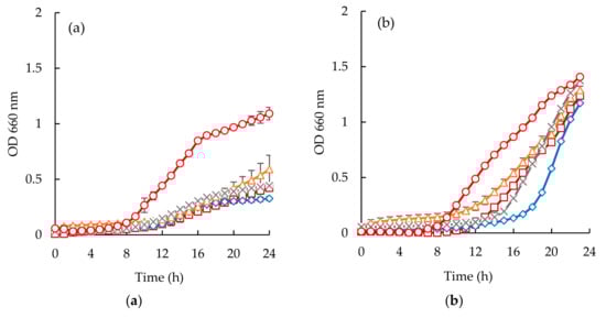 Considering the Staphylococcus aureus strain, it is interesting to highlight the different behaviors observed between the two different samples (Figure 6b and Figure 7b). Codfish blood and obtained permeates caused a significant delay of the lag phase, while sardine cooking wastewaters and corresponding permeates had no effect on the OD after incubation for 24 h. Besides, the strain of Staphylococcus aureus exhibited higher lag phases when exposed to permeates of UP010 and MW compared to codfish blood, and the PW permeate. It is interesting to note that, peptide fractions from UP010 membrane appeared to induce the highest reduction of OD, while the other permeates exhibited an OD, after 24 h, similar to the one observed for the positive control although the maximum OD registered over the 24 h period was lower than the one registered for the positive control (Figure 6b).