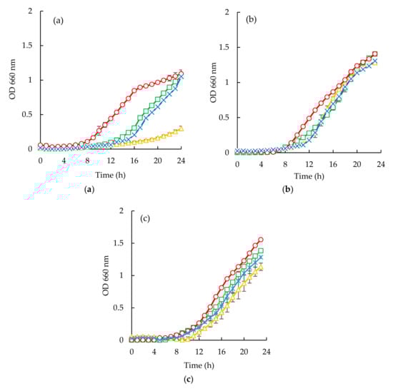 Time inhibition curves drawn with permeates obtained from sardine cooking wastewaters (○, positive control; □, cooking wastewater; Δ, GE Suez GH (1.0 bar); x, GE Suez GH (5.0 bar) for E. coli (a), S. aureus (b), C. albicans (c).