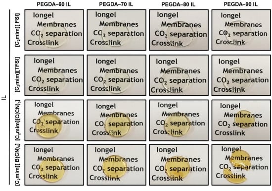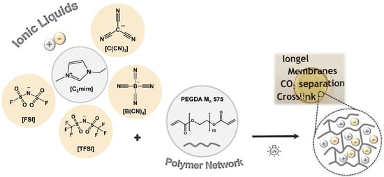 In this work, iongels based on cross-linked PEGDA and four different ILs, combining the [C2mim]+ cation and anions such as [TFSI]−, [FSI]−, [C(CN)3]− and [B(CN)4]− (Figure 1), were prepared with IL contents between 60 and 90 wt %. The influence of both the IL content and IL anion on the iongels’ chemical structure, thermal and mechanical stability, as well as CO2 solubility, was systematically investigated by various characterization techniques. Single-gas permeation measurements were also conducted to evaluate the potential of the prepared iongels as CO2 separation membranes. The choice of the IL anions was dictated by the high CO2 permeabilities and selectivities previously obtained through SILM configurations [,,]. Although cross-linked PEGDA membranes demonstrated improved gas transport properties when longer PEGDA (Mn 700 g mol−1) monomer was used [], a shorter PEGDA monomer (Mn 575 g mol−1) was selected for this study, mainly due to the higher cross-linking density of the resulting polymer network, so that iongels with high IL contents and self-standing properties could be obtained.