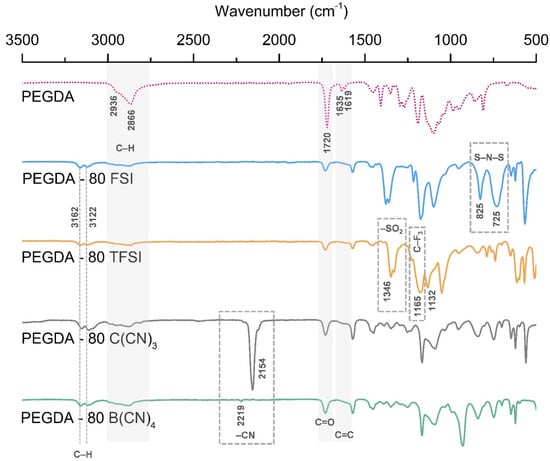 FTIR spectroscopy was used to confirm the chemical structure of the prepared iongels, as well as to observe the variation in the peaks associated with the reactive acrylate double-bond on the PEGDA-based polymer network. The obtained FTIR spectra of the pristine PEGDA and the iongels containing 80 wt % of the different ILs studied are depicted in Figure 3.