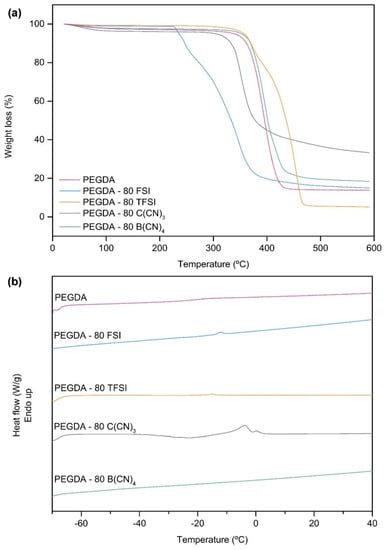 The thermal properties of the cross-linked PEGDA, neat ILs and respective iongels were also characterized by DSC analysis. The melting (Tm) and glass transition (Tg) temperatures, in the cases where they were observed, are listed in Table 1. The DSC curves of the iongels with 80 wt % IL content are depicted in Figure 4b, while the DSC curves of all the prepared iongels are provided as Supplementary Materials (Figure S6).