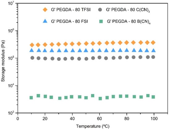 The mechanical properties of the iongels were evaluated by DMTA. Specifically, the effect of both the IL content and IL anion structure were assessed, and the cross-linked architecture of the iongels was confirmed. The curves of the storage modulus (Pa) as a function of temperature (°C) of the iongels with 80 wt % IL content are illustrated in Figure 5, while the DMTA analyses of all the prepared iongels are given in Supplementary Materials (Figure S7). It is worth mentioning that it was not possible to perform the DMTA analysis with PEGDA–90 B(CN)4 owing to its fragility and, consequently, the easy breakability when handling the sample (Figure 2). Likewise, the sensitivity of the DMTA device prevented a reliable measurements of loss modulus for the iongels with 90 wt % IL content, as well as for the ones containing 80 wt % of the cyano-based ILs. For that reason, only the storage moduli of those iongels are represented in Figure S7.
