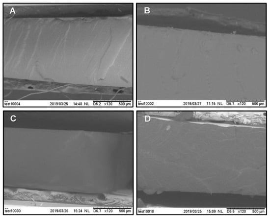 A selection of SEM micrographs of a fracture in the cross-section of the iongels with 80 wt % IL content is shown in Figure 6. The different ILs were successfully incorporated into the PEGDA polymer network. Dense membrane morphologies and defect free structures were obtained, since agglomeration due to phase separation or noticeable deformations were not detected. This is obviously due to the good miscibility between the different ILs and the polymer network. Note that, for the SEM micrographs A and D, it is possible to see some randomly distributed reliefs, which are probably related to plastic deformation during the fracturing process under liquid nitrogen. In general, the prepared iongels are soft and ductile materials, thus it is not easy to fracture their samples and achieve clean cuts.