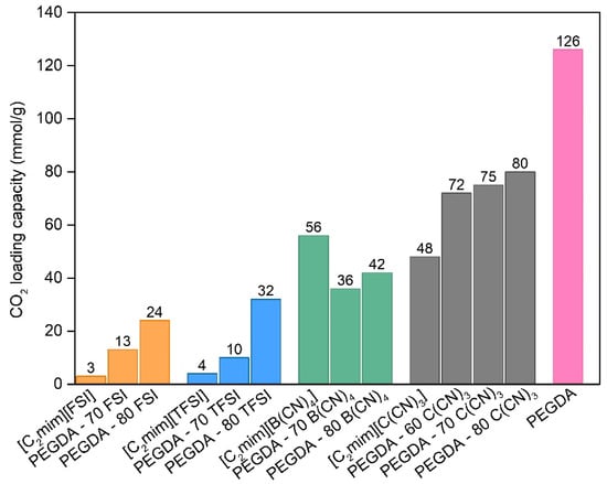 Carbon dioxide loading capacity (expressed in mmol of CO2 per g of sample) for the different iongels, neat ILs and cross-linked PEGDA were determined by the pressure decay method until its saturation. The values obtained are reported in Figure 7.