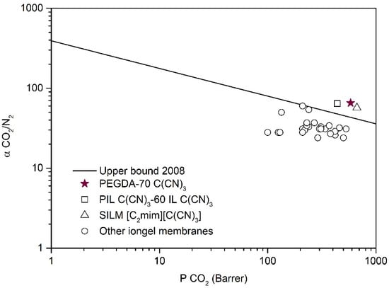 From Figure 8, it can also be observed that the CO2/N2 separation performance of the PEGDA–70 C(CN)3 iongel is superior when compared to those recently reported for other PEG-based cross-linked iongel membranes [,,], probably due to the different cross-linking densities and polymer matrices, as well as the IL used. These results clearly indicate that the combination of a PEGDA monomer (Mn 575 g mol−1) with high contents of the best performing ILs can lead to enhanced CO2/N2 separation performances.