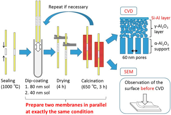 The membranes used in this research consisted of three layers: a commercial α-alumina support (Noritake Co.) with nominal pore size of 60 nm, a γ-alumina intermediate layer deposited by sequential dip-coating/calcining, and a topmost silica layer placed by chemical vapor deposition (CVD). Before silica deposition, two membranes were synthesized in parallel under the same conditions (Figure 1). Then, one membrane was used for CVD and the other membrane was used for scanning electron microscopy (SEM) analysis to have identical substrates for clarifying the relationship between the surface or cross-sectional morphology and the gas separation ability.