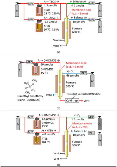 To synthesize DMDMOS membranes, both counter-diffusion CVD (Figure 2b) and one-sided diffusion CVD (Figure 2c) were applied, whereas the previous study [17] dealt with only counter-diffusion CVD. Particularly, the one-sided diffusion CVD made it easier to add the stream of ATSB to improve the hydrothermal stability. In both cases, the CVD temperature was set at 500 °C in order to prevent support cracking due to the large reaction heat between DMDMOS and O2 in accordance with the previous report [17].