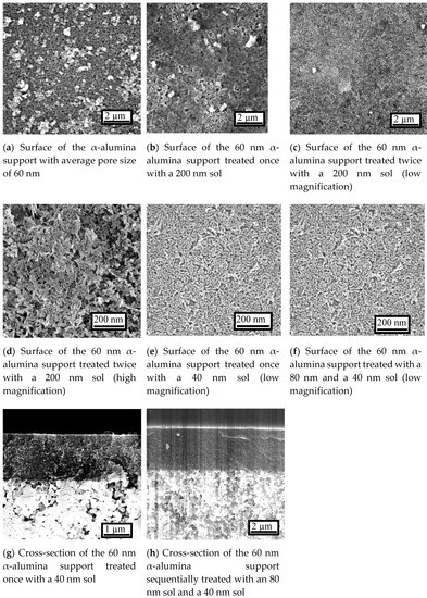 The γ-alumina surface prepared by dip-coating the α-alumina support with a 40 nm sol (Figure 4e) and 80 and 40 nm sols (Figure 4f) shows the successful formation of smooth and uniform γ-alumina layers. In addition, their cross-sectional images show that the thickness of the γ-alumina layer was about 1 μm for the former (Figure 4g) and about 2 μm for the latter (Figure 4h). These results suggest that macro-porous α-alumina can be completely covered by γ-alumina even if the boehmite particle size is smaller than, or similar to, the support pore size. This has not been reported before.
